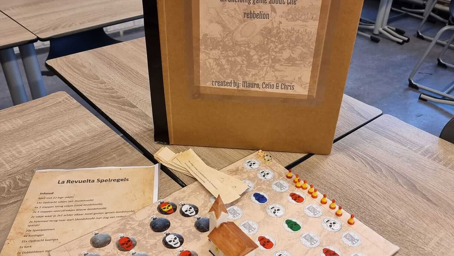 Klas 2A mocht voor geschiedenis een eigen opdracht bedenken. De leerlingen hebben gekozen om een eigen bordspel te maken met als thema de Nederlandse Opstand en/of de Renaissance. Het resultaat mag er wezen: prachtige bordspellen inclusief zelfgemaakt pionnetjes, spelregels, vragenkaartjes etc. Wat een creativiteit!